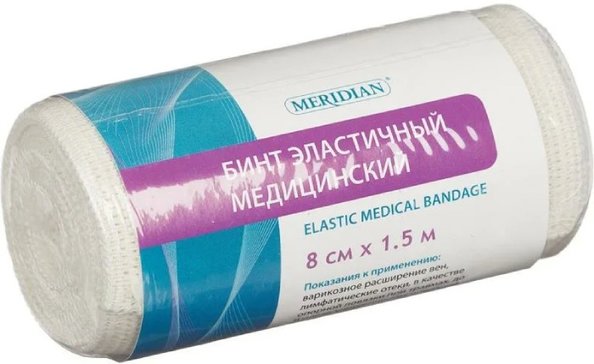 Бинт медицинский эластичный “Меридиан” Произведен из натурального сырья, гипоаллергенный, края аккуратно обработаны, имеет две удобные клипсы для фиксации, товар запаян в термоусадочную пленку